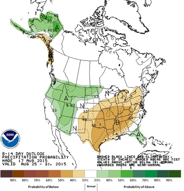Previsão de chuvas nos EUA entre os dias 25 a 31 de agosto - Fonte: NOAA