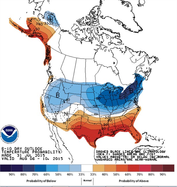 Temperaturas nos EUA entre os dias 6 a 10 de agosto - Fonte: NOAA