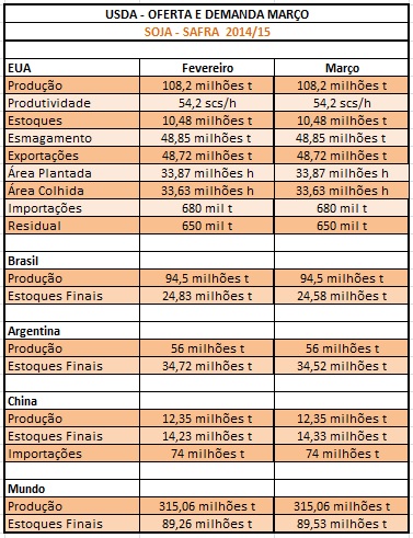 Os estoques finais de soja foram mantidos em 10,48 milhões de toneladas nos EUA, as exportações e o esmagamento interno em 48,72 e 48,85 milhões de toneladas. No quadro da América do Sul, a produção brasileira foi mantida em 94,5 milhões de toneladas e a da Argentina em 56 milhões. Todos os números em linha com os reportados em fevereiro.